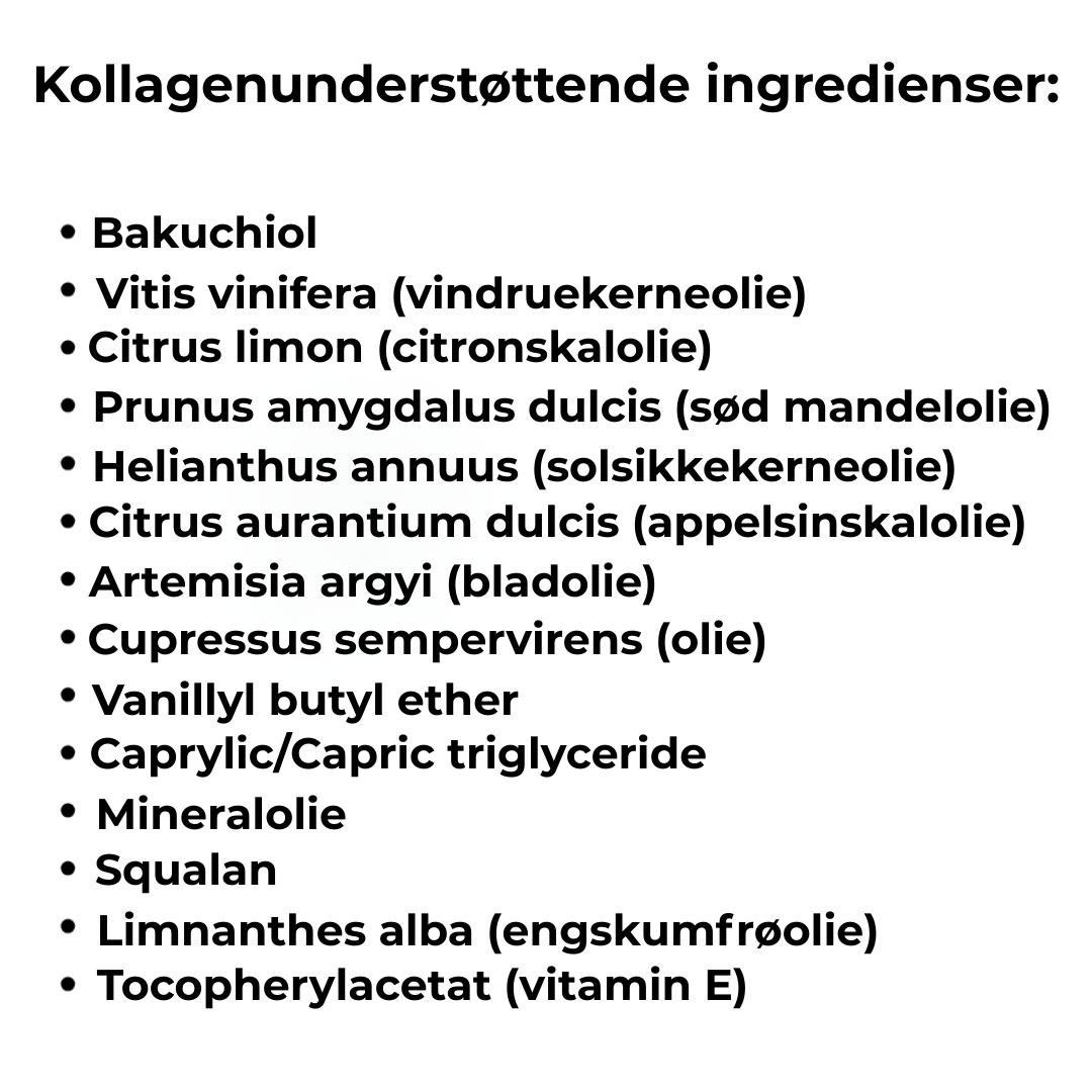 - Vindruvkärnolja (naturlig): Visad i en klinisk studie (J Cosmet Dermatol, 2022;21:2600–2608) att förbättra hudens elasticitet och hydrering samt bidra till en mer jämn hudton och mjukare, slätare hud.