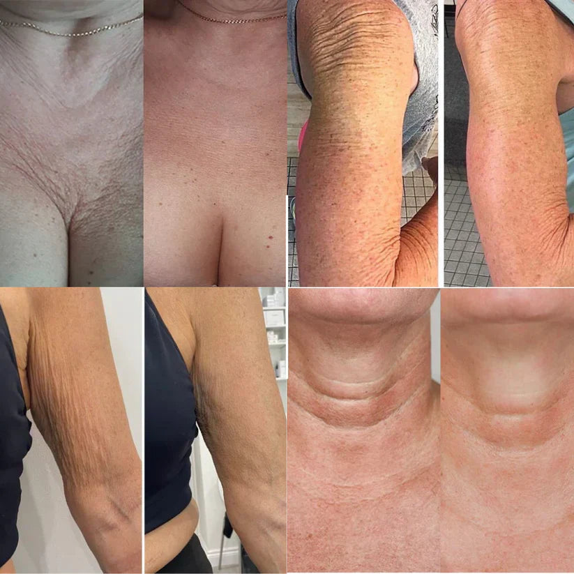 Noggrant utvalda ingredienser för att fukta, strama upp och mjuka upp områden där huden ofta hänger – såsom hals, armar, lår, mage och rumpa!