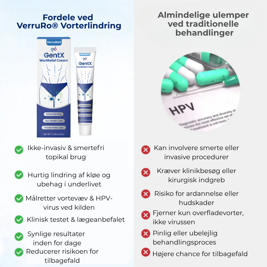 VerruRo® GentX Vårtlindringskräm riktar sig mot både de synliga vårtorna och den underliggande HPV-infektionen med kliniskt dokumenterade ingredienser.